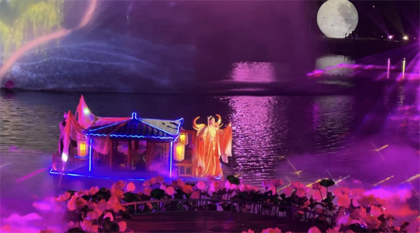 柳叶湖旅游度假区联合湖南省演艺集团打造的大型奇幻光影水秀《柳叶船说》,运用极具科技感的裸眼3D技术,将中华诗词之美、音律之美、舞蹈之美、服装道具之美融入充满科技含量的时尚视听元素中。该剧目依托柳叶湖丰富多元的本土文化,在神话传说《盘古开天》《刘海砍樵》的基础上,以刘禹锡的视角讲述了“刘海哥”与“小湖仙”穿越千年的爱情传说。柳叶湖独有的湖面景观构成了《柳叶船说》天水相接的水幕特效,让观众仿若置身幻境,沉醉于刘海与柳叶湖仙缠绵悱恻、感动天地的爱情之中。