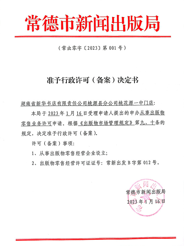 2023年行政许可决定书(湖南省新华书店有限责任公司桃源县分公司桃花源一中门店)